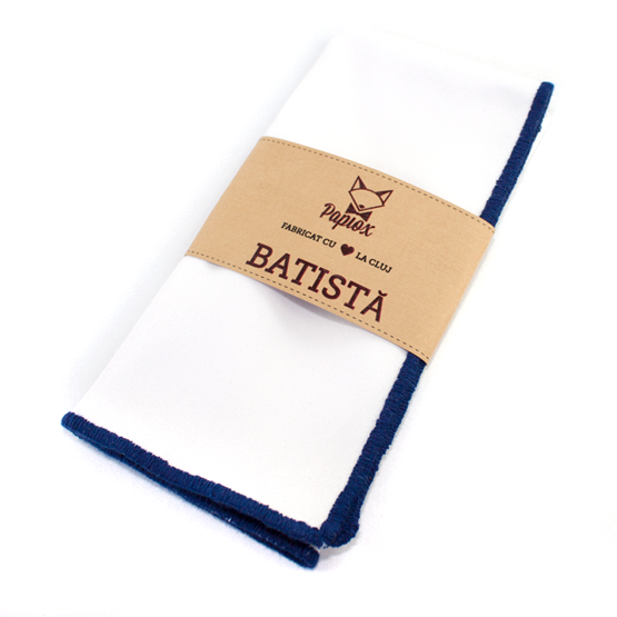 Batista de buzunar alba cu marginile surfilate cu albastru. Pentru alte culori de margini va rugam contactati-ne.